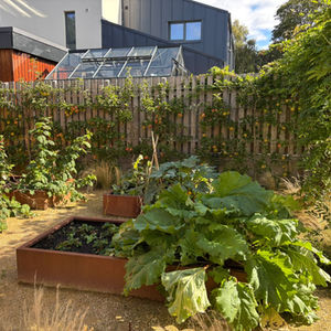 The rustic design incorporates corten steel planters, edging, and self-binding gravel, prioritising practicality while enhancing aesthetics for a harmonious outdoor space allowing for leisure and play.